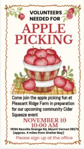 Let’s take a field trip! Come join apple picking fun at Pleasant Ridge Farm on November 10th at 10AM. We are stocking up for the Cider Squeeze Event on November 15th and could use some helping hands. Call the office for more details or email David Anderson.