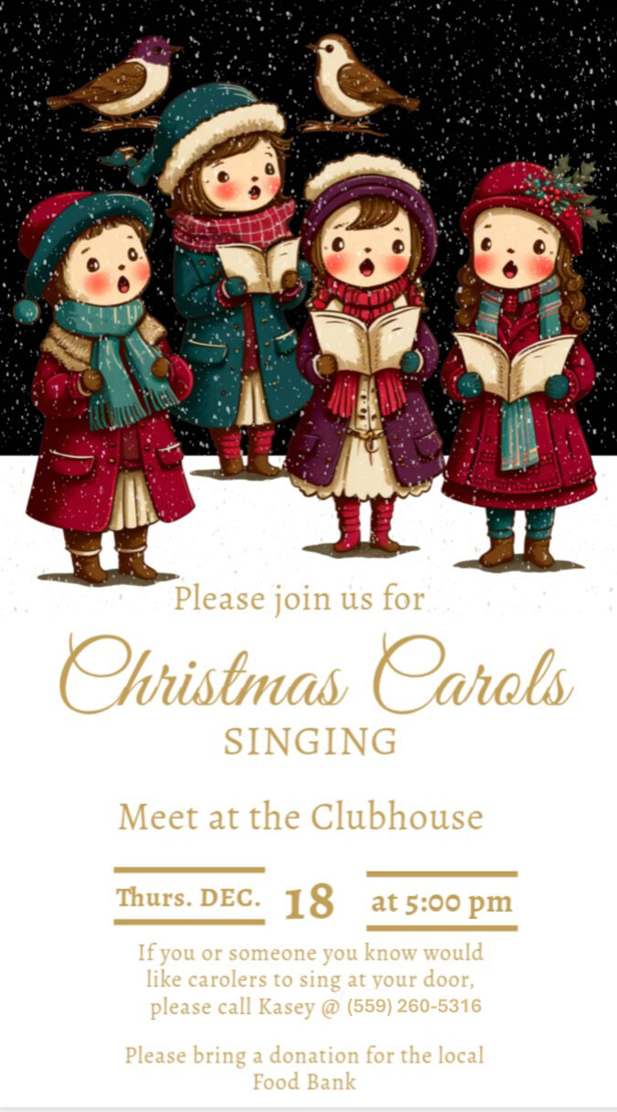 Dec 18 Christmas Caroling for the Community *, meet at Clubhouse, 5 PM