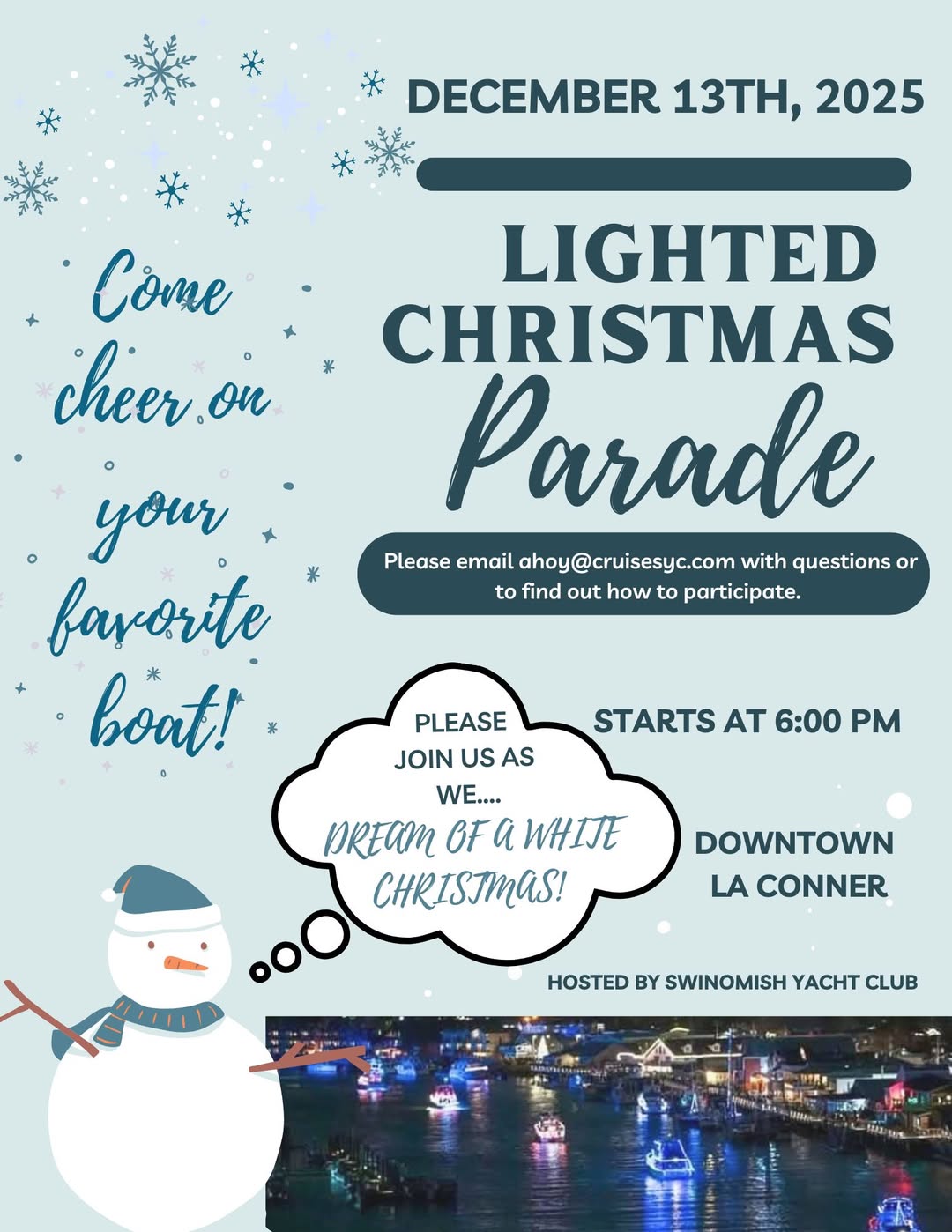Dec 13 Swinomish Yacht Club’s Lighted Christmas Parade, Downtown La Conner, 6 PM