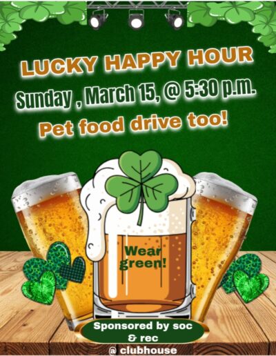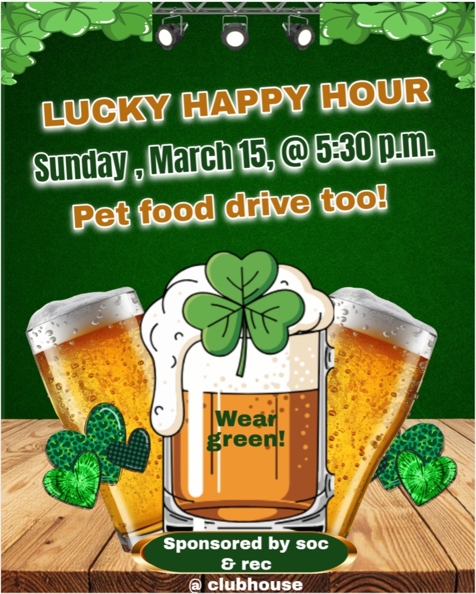 Mar 15 Lucky Happy Hour & Pet Food Drive *, in Clubhouse, 5:30 PM