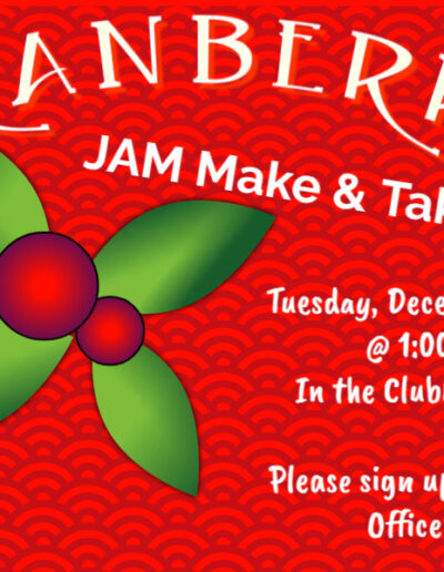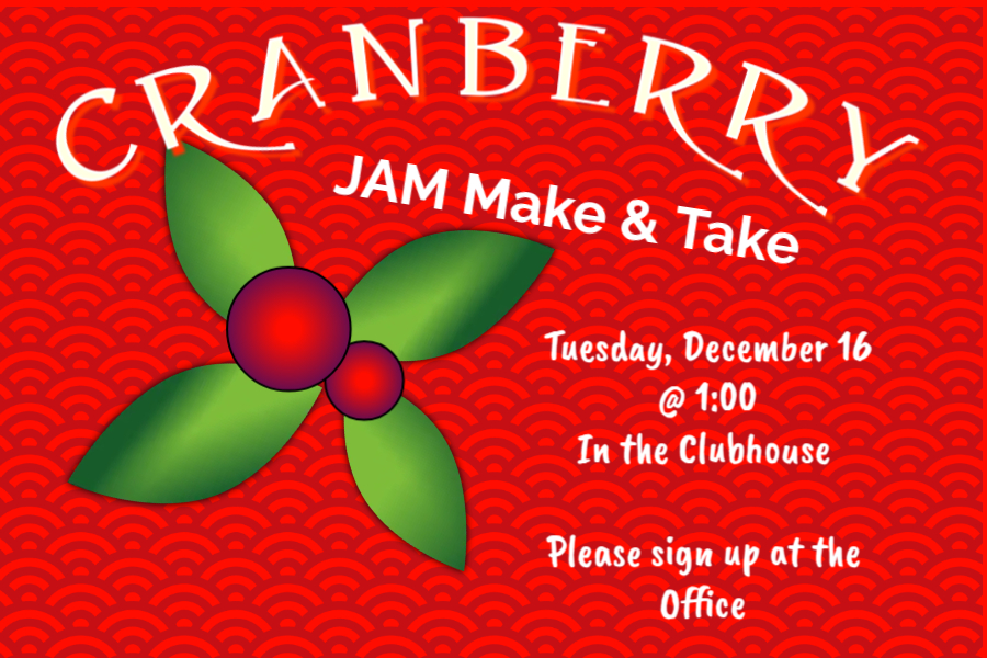 Dec 16 Christmas Cranberry Jam Making Demo *, in the Clubhouse, 1 – 3 PM